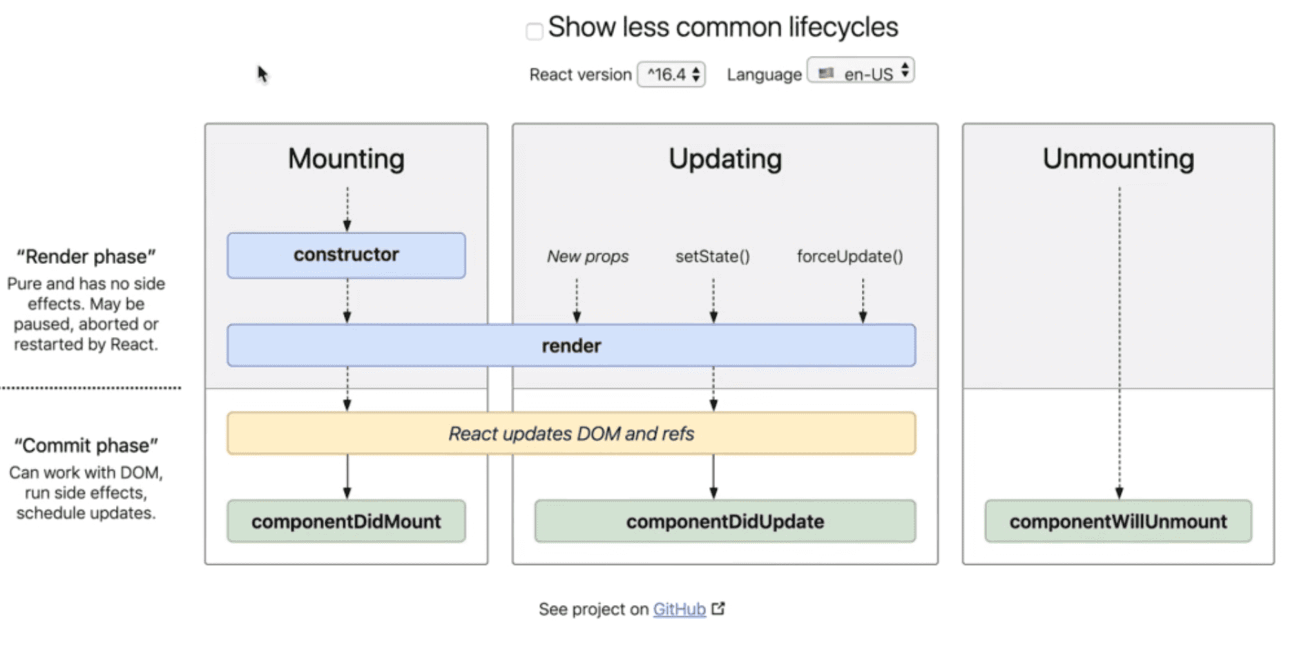 The first phase is the mounting phase is when the component is being put the DOM for the first time. And is the first phase to run. And calls the constructor.