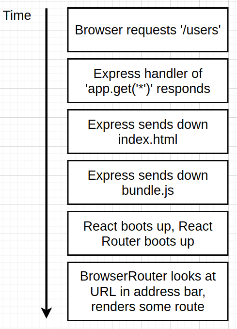 - express route handler will delegate requests to react router instead of handling it. So react router has the final saying in what gets shown on the screen. (both on server -delegating reqs to it by express handler- and on client when hydration occur).