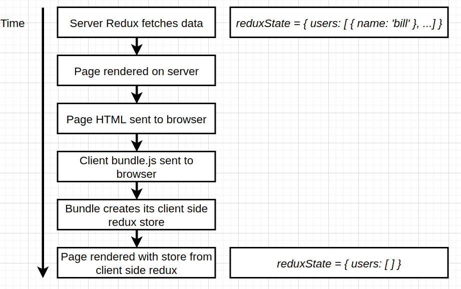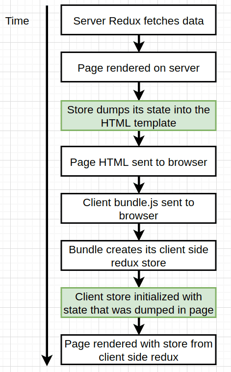 - the solution simply is to dump server store state into the HTML template and when bundle is shipped to the browser it will use the dumped data inside the HTML to init the browser store with it.