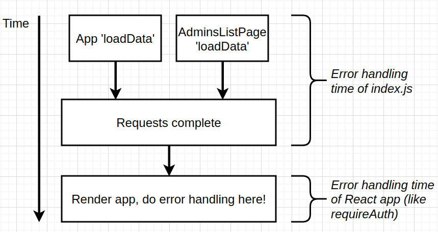 the below diagram shows that we have separated data fetcing process from error handling process. And very importantly if an error occurs during data fetching, we are still rendering the application and only then we handle errors.