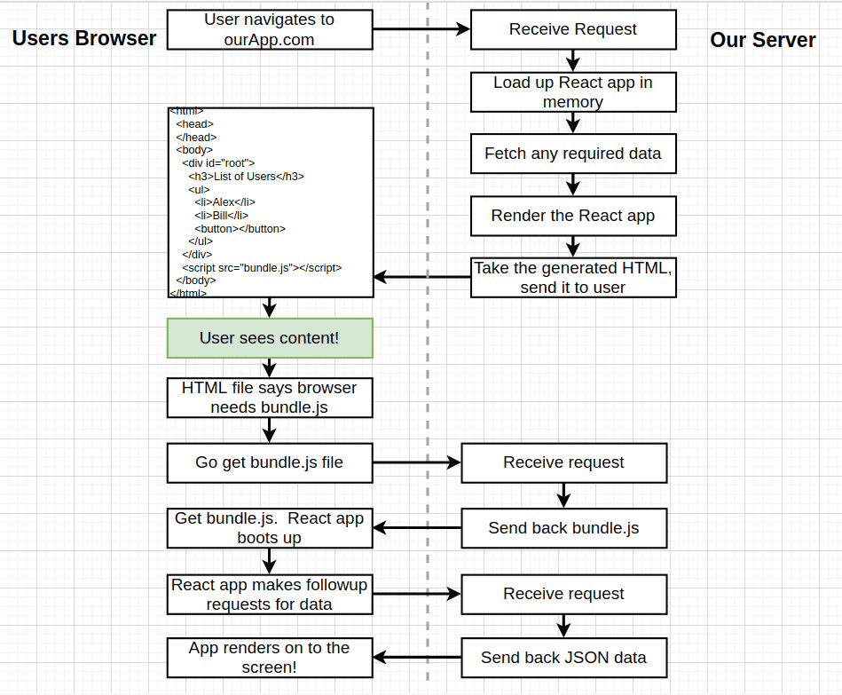 - But in the case of SSR, no JS files are sent to the user by default, So, we need, after sending HTML, to send our react app that have the JS functionality.