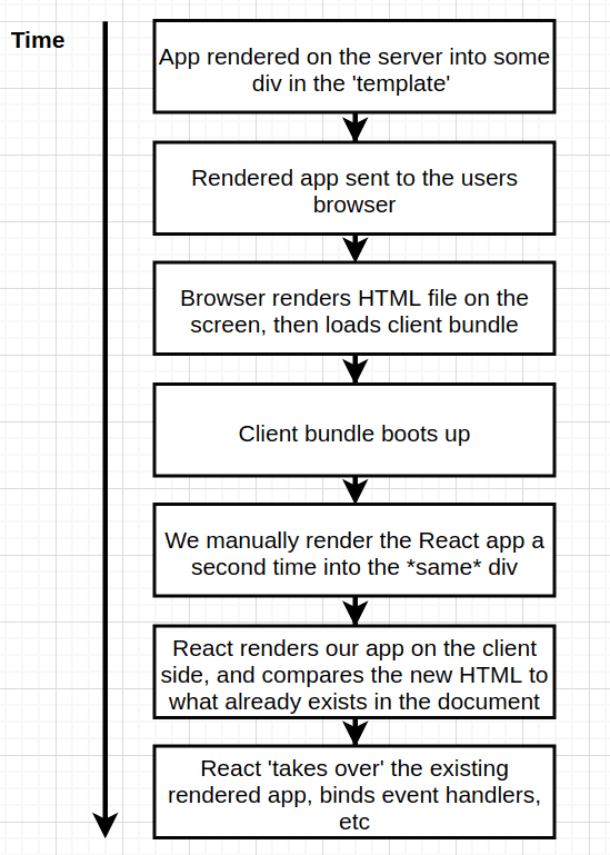 - ReactDOM.renderToString: renders a bunch of components one time and produces a string out of all the resulting HTML.