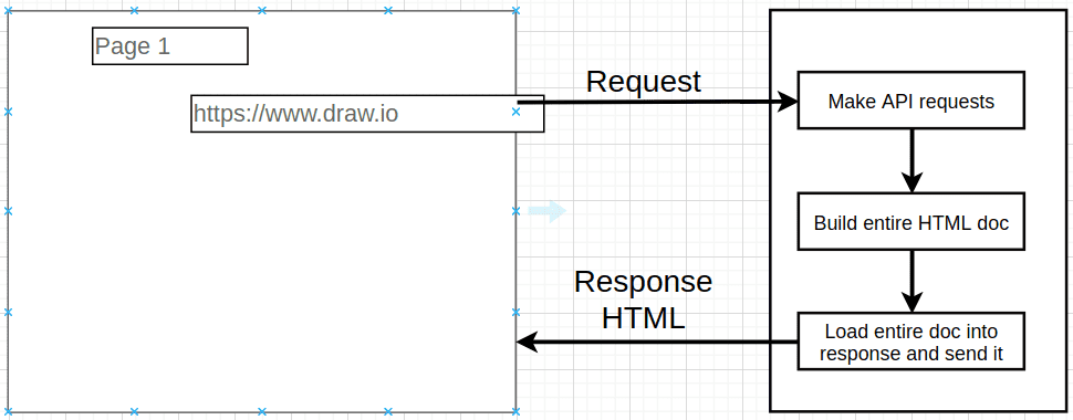 - The browser makes a request to the server (hosting the app), and an html document is returned by the server