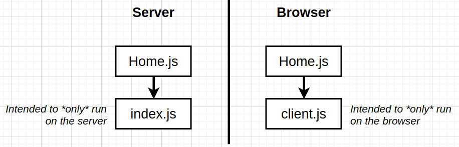 indexjson the server depends on theHome.jscomponent, and also theclientjsfile depends onHome.jscomponent, but we need the segregation between them for many reasons, the first one being server code might have sensitive data that cannot be sent to the client -