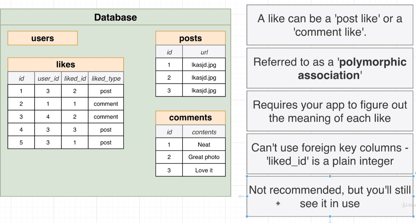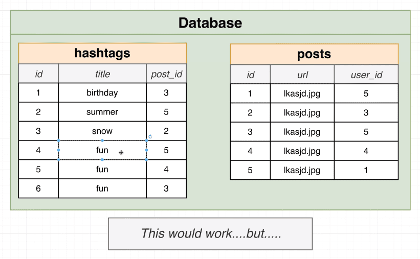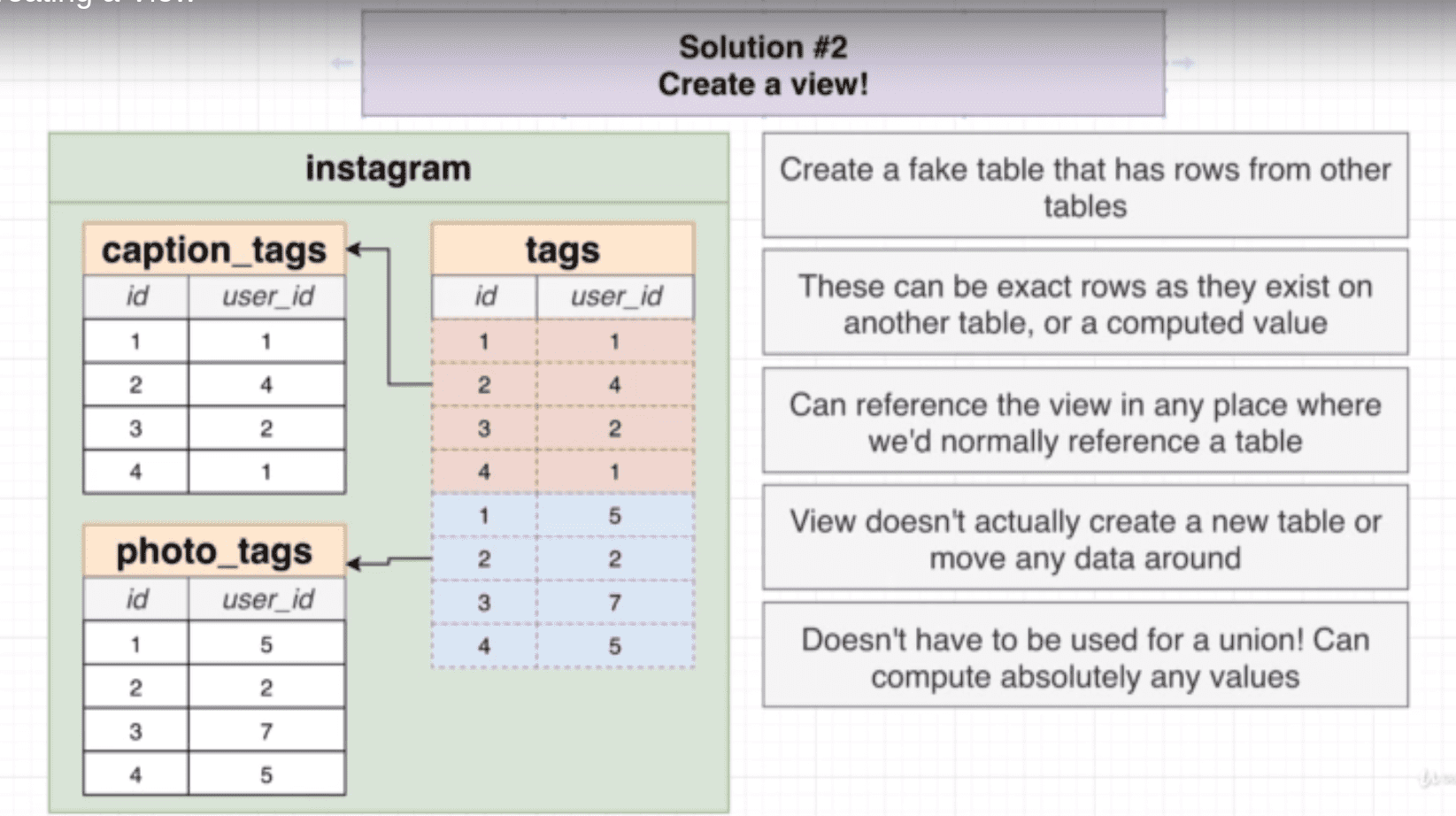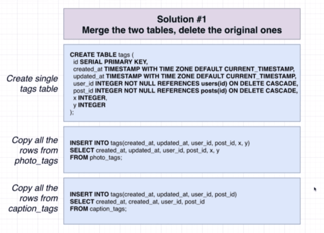 - This has some serious drawbacks, we can't copy over the ID's of photo_tags and caption_tags since they must be unique, and if we delete original tables we break any existing queries that refer to them.