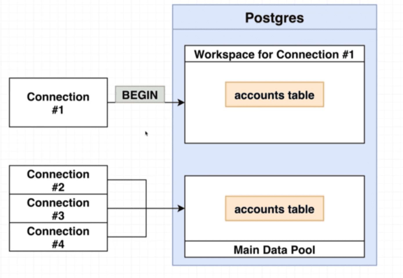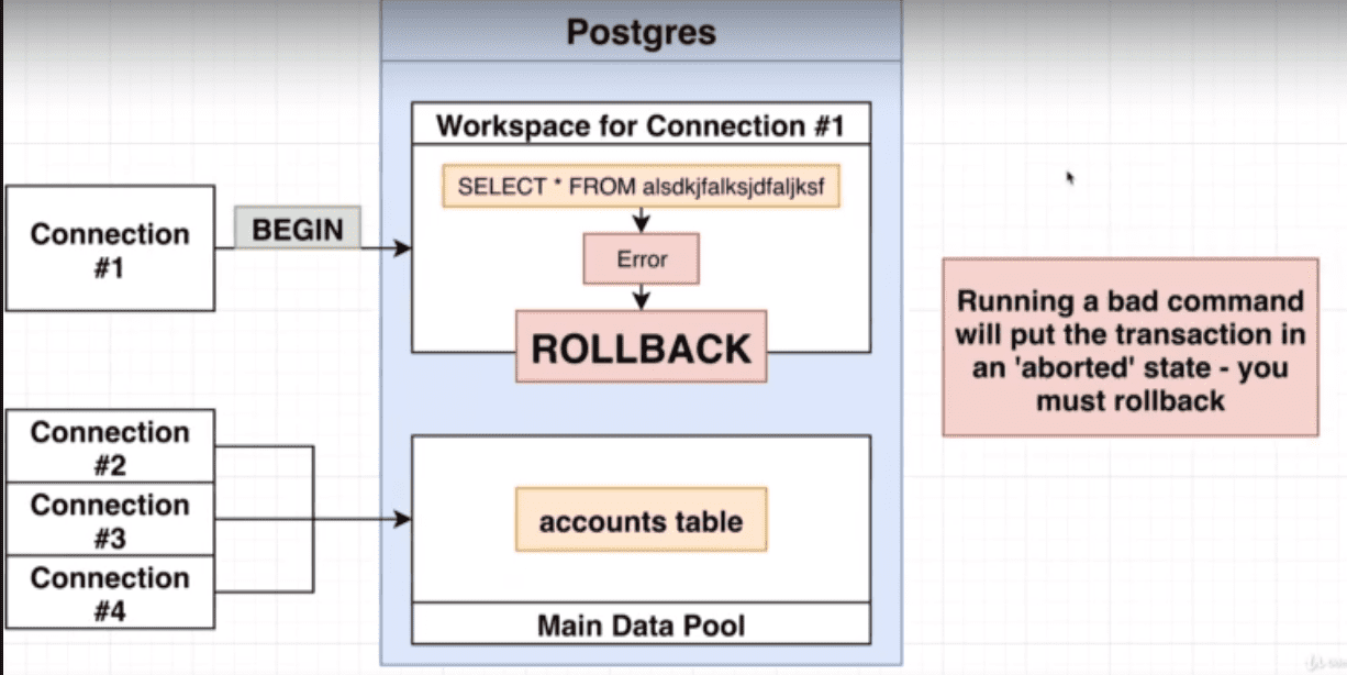 BEGIN;. - When a connection calls the DB server with the BEGIN keyword, it (connection) enters a different/isolated state. And you can imagine as if DB created a copy of the data to work with, (NOTE NO DATA WERE ACTUALLY COPIED)