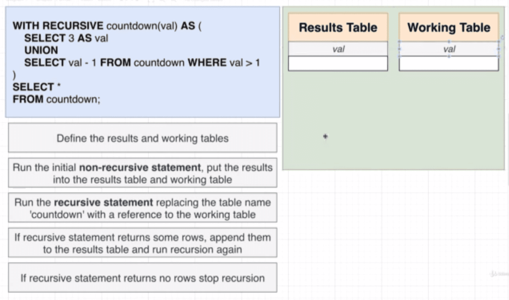 - aggregations: This is important to understand. No matter where you put your aggregate function syntactically (i.e. in the SELECT clause, or in the ORDER BY clause), this here is the step where aggregate functions are calculated. Right after GROUP BY. (remember: logically. Clever databases may have calculated them before, actually). This explains why you cannot put an aggregate function in the WHERE clause, because its value cannot be accessed yet. The WHERE clause logically happens before the aggregation step. Aggregate functions can access columns that you have put in “this list” for each group, above. After aggregation, “this list” will disappear and no longer be available. If you don’t have a GROUP BY clause, there will just be one big group without any key, containing all the rows.